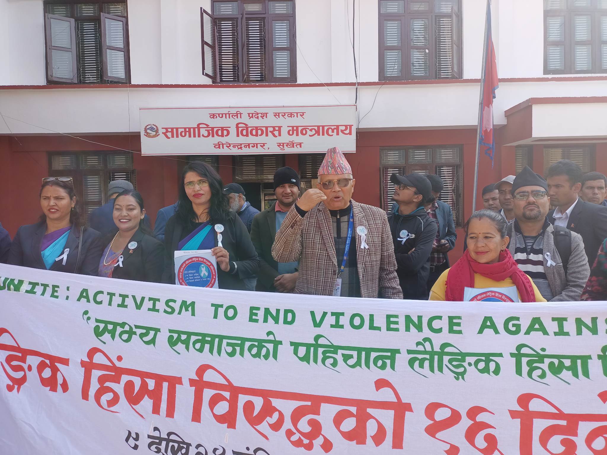 सुर्खेत । सामाजिक विकास मन्त्रालय कर्णाली प्रदेशको नेतृत्वमा वीरेन्द्रनगर नगरपालिका तथा विभिन्न संघसंस्थाहरुको सहकार्यमा आज लैगिंक हिंसा विरुद्धको १६ दिने अभियानको विभिन्न कार्यक्रम गरि उद्घाटन गरिएको छ । हरेक वर्ष नोभेम्बर २५ देखी डिसेम्बर १० (२०७९ मंसिर ९ गते देखि २४ सम्म) यो अभियान विश्वभर मनाइन्छ ।
