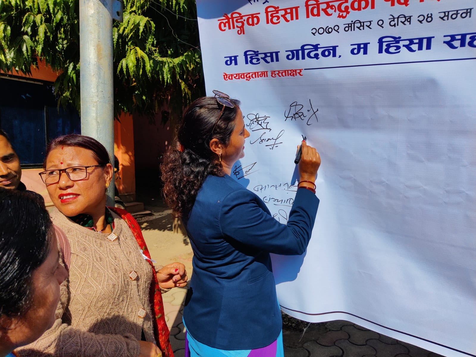 यो वर्ष अन्तराष्ट्रिय नारा UNITE! ACTIVISM TO END VIOLENCE AGAINST WOMEN AND GIRLS! का साथ विश्वभर र राष्ट्रिय नारा “सभ्य समाजको पहिचानः लैङ्गिक हिंसा विरुद्धको अभियान” का साथ नेपालभर मनाइदै छ । आज सामाजिक विकास मन्त्रालयबाट अभियानको उद्घाटन गरी वीरेन्द्रनगर नगरपालिकामा हस्ताक्षर संकलन गरिएको थियो ।