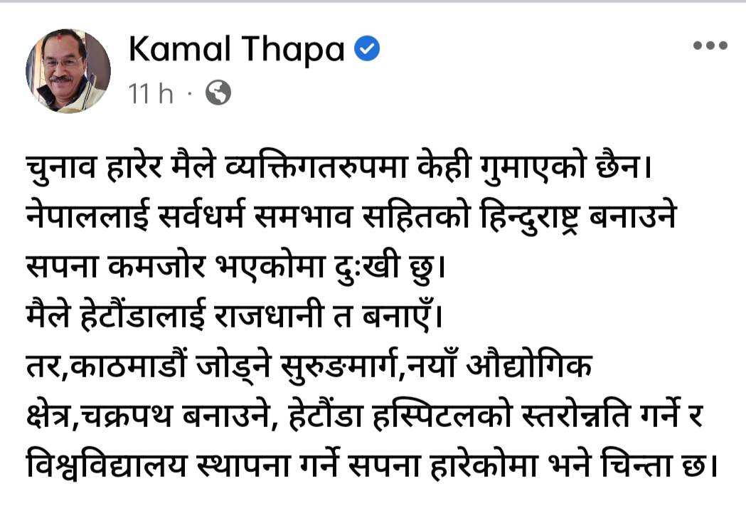 सामाजिक सञ्जालमार्फत् उनले आफूले चुनाव हारेर केही नगुमाएको तर हिन्दु राष्ट्र, काठमाण्डौ जोड्ने सुरुङमार्ग, नयाँ औद्योगिक क्षेत्र,चक्रपथ बनाउने, हेटौँडा हस्पिटलको स्तरोन्नति गर्ने र विश्वविद्यालय स्थापना गर्ने सपना हारेकोमा भने चिन्ता लागेको बताएका हुन् ।