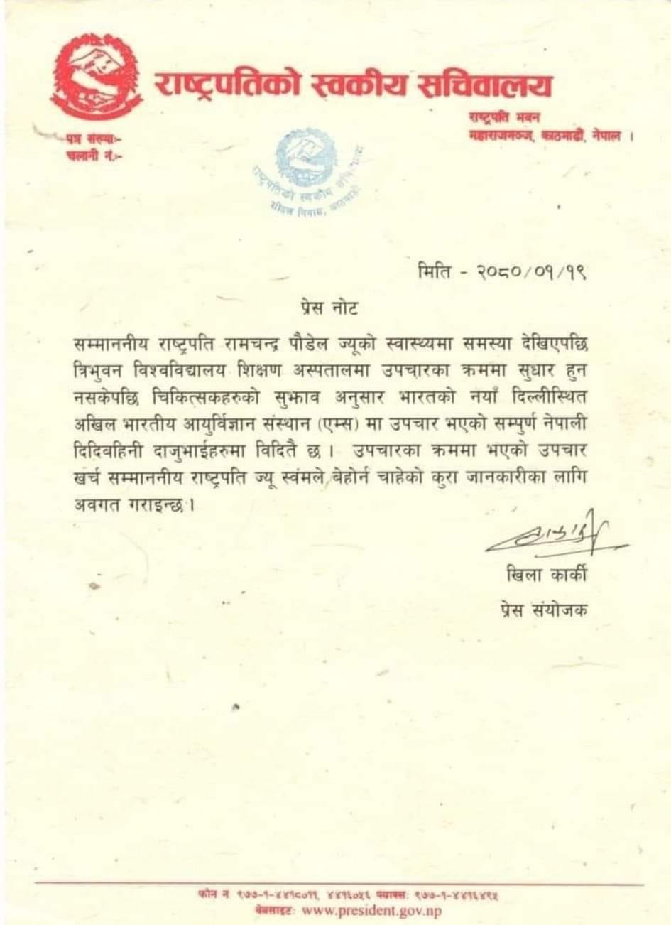 तर राष्ट्रपति पौडेललाई उपचारका लागि भारत लैजाँदा मेडिकल बोर्डको स्वीकृति लिइएको थिएन ।