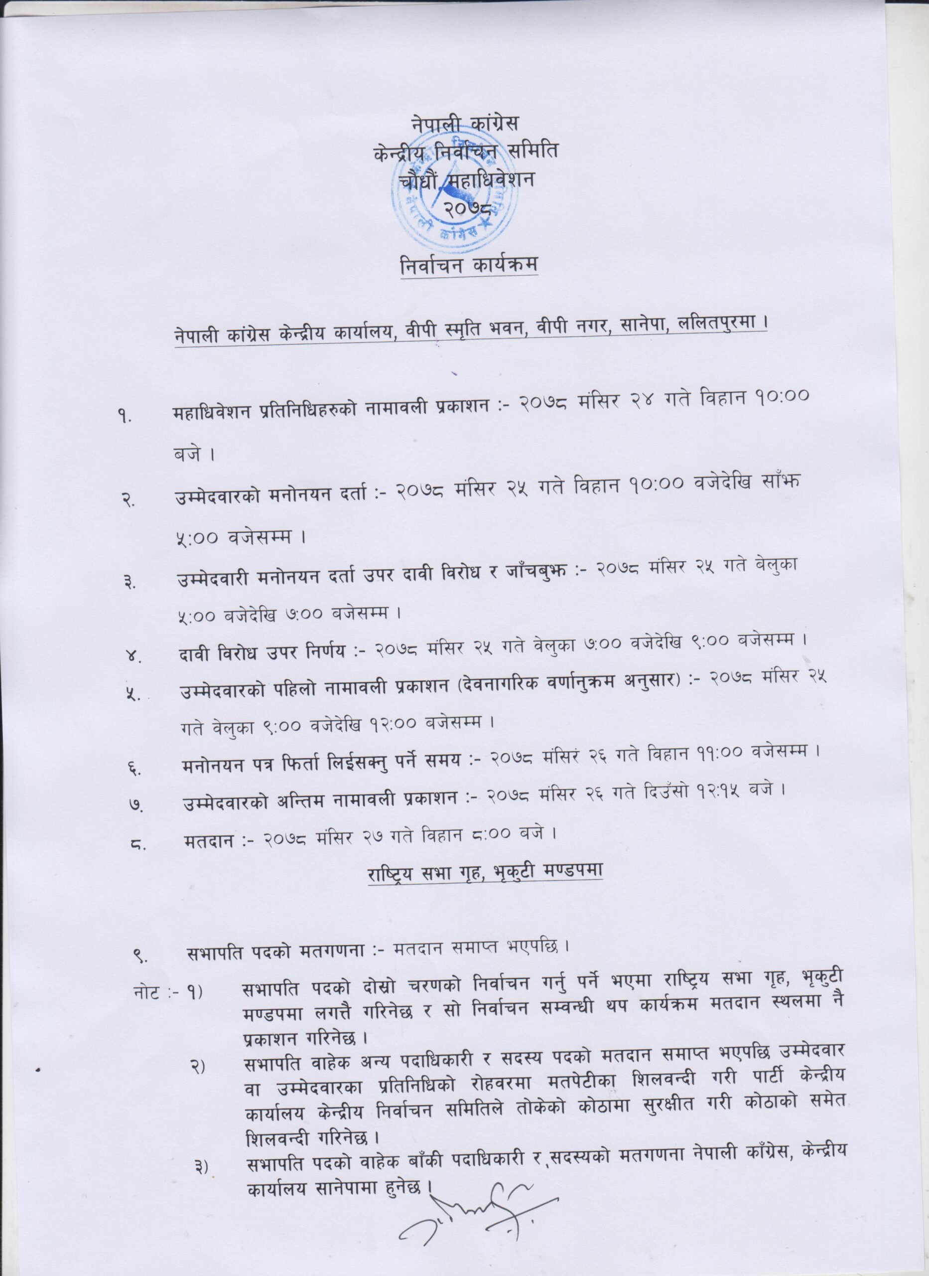 काठमाडौं । । नेपाली कांग्रेसको पर्सि मङ्सिर २४ गते शुक्रवारदेखि सुरु हुने महाधिवेशनका लागि निर्वाचन कार्यतालिका प्रकाशन भएको छ ।