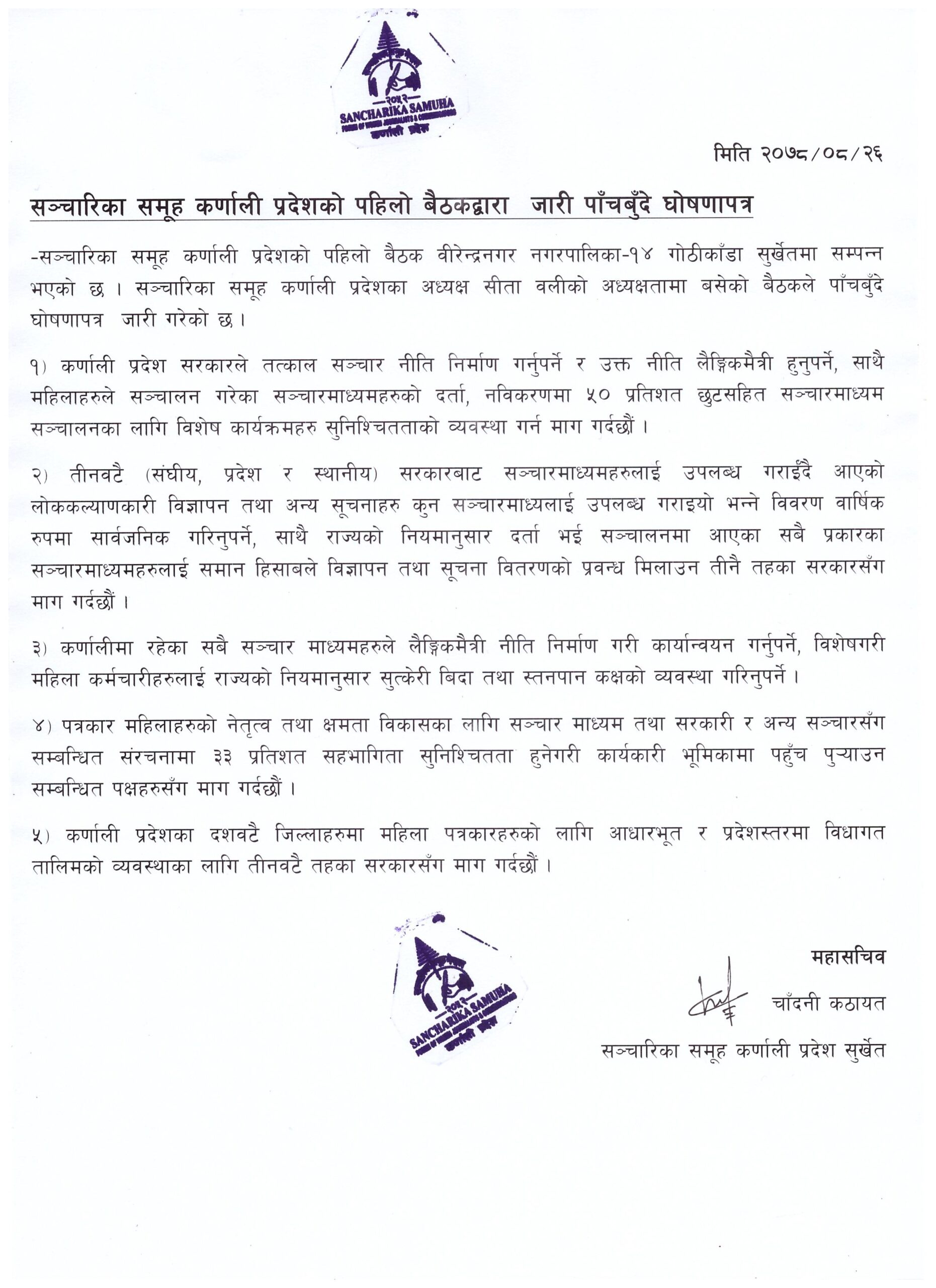 घोषणापत्रमा कर्णाली प्रदेश सरकारले तत्काल सञ्चार निति निर्माण गर्नुपर्ने र उक्त निति लै¨िकमैत्री हुनुपर्ने, साथै महिलाहरुले सञ्चालन गरेका सञ्चारमाध्यमहरुको दर्ता, नविकरणमा ५० प्रतिशत छुटसहित सञ्चारमाध्यम सञ्चालनका लागि विशेष कार्यक्रमहरु सुनिश्चितताको व्यवस्था गरिनुपर्ने,