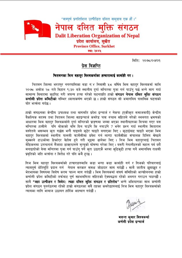 सुर्खेत । चितवनका भिम बहादुर विश्वकर्माका हत्यारालाई कारबाहीको माग गरिएको छ । नेपाल दलित मुक्ति संगठन कर्णाली प्रदेश कमिटिले विश्वकर्माका हत्यारालाई कारबाहीको माग गरेको हो ।